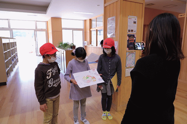 クイズが終わると、調理員さん、5・6年生の代表児童、お店屋さんの代わりに6年生の代表児童に子供たちからのプレゼントを渡しました。