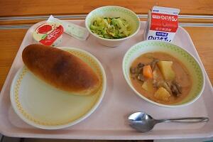 黒糖パン、ビーフシチュー、フレンチサラダ、りんごゼリー、牛乳