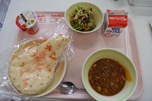 ナン、キーマカレー、ひじきとチーズのサラダ、カップdeヤクルト、牛乳