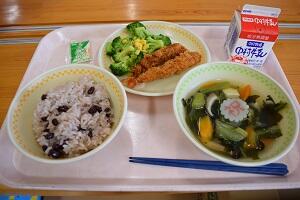 麦ごはん、豆腐とわかめのみそ汁、鶏肉のからあげ、野菜のレモンあえ、牛乳