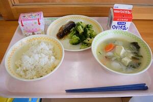 麦ごはん、豚汁、ゆでブロッコリー、いわしのおかか煮、お祝いケーキ、牛乳