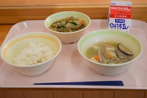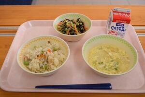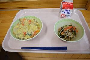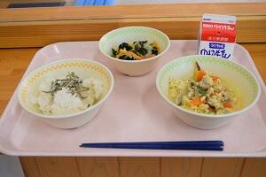 とりめし・牛乳・洋風白あえ・かにの中華スープ