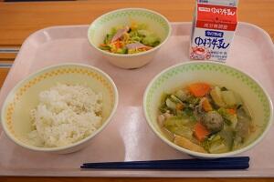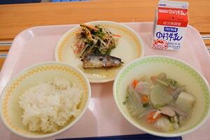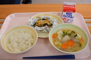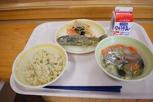 麦ごはん、牛乳、魚のゆずみそかけ、こんぶあえ、けんちん汁