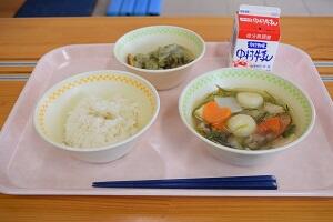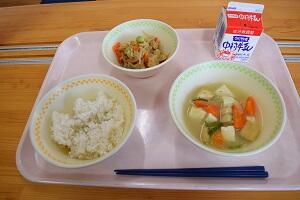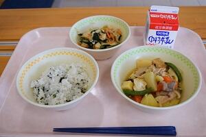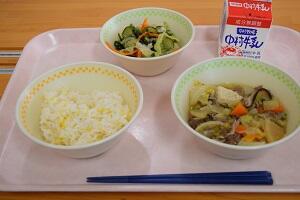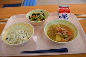 あじそぼろご飯・牛乳・のっぺい汁・野菜のごまあえ・みかん