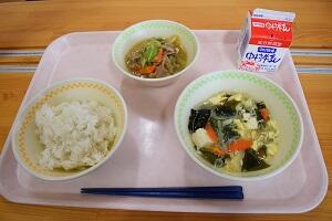 麦ごはん、牛乳、揚げ豆腐のあんかけ、春雨の酢の物