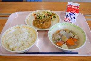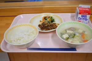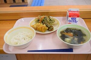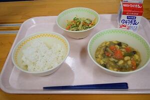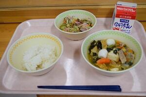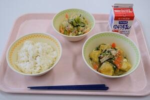 麦ご飯・牛乳・厚揚げのいそ煮・三色あえ