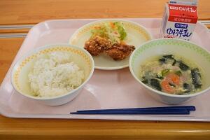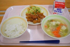 麦ご飯・牛乳・とりのから揚げ・れんこんサラダ・貝柱スープ