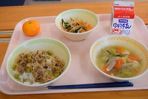 麦ごはん・牛乳・ぶりのおろし煮・いんげんのごま酢あえ・のっぺい汁・節分豆