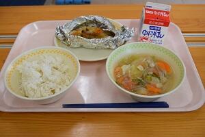 麦ご飯・牛乳・さけときのこのチーズ焼き・マロニースープ