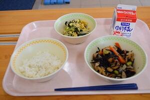 麦ご飯・牛乳・五目豆・きゅうりとちりめんの酢のもの
