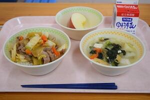 麦ご飯・牛乳・豚肉と白菜のピリ辛炒め・ポテトサラダ