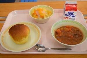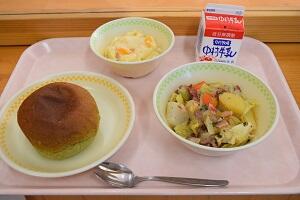 よもぎパン・牛乳・洋風肉じゃが・フルーツカスタード