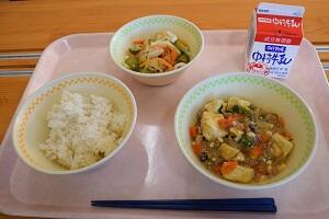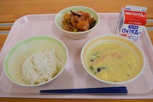 麦ごはん・牛乳・鶏肉のチリソース煮・中華風コーンスープ煮