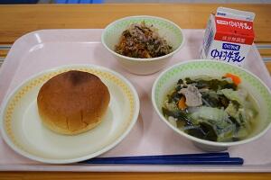 黒糖パン、牛乳、たこ焼き風、わかめスープ