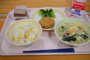 コーンごはん・牛乳・カレーメンチカツ・ブロッコリー・卵スープ・デザート