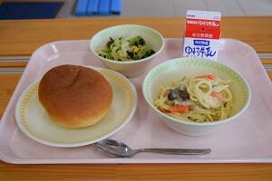 コッペパン・牛乳・クリームスパゲティ・ほうれんそうとコーンのサラダ