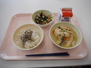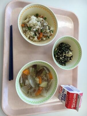 とりめし、牛乳、ひじきの白和え、五目汁