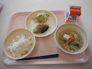 麦ごはん、牛乳、さばの照り煮、はりはりづけ、みそのっぺい汁
