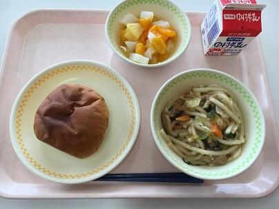 黒糖パン、牛乳、焼きうどん、杏仁豆腐