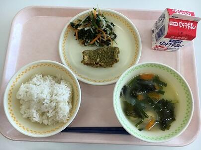 麦ごはん、牛乳、ぶりのおろし煮、キャベツの和え物、