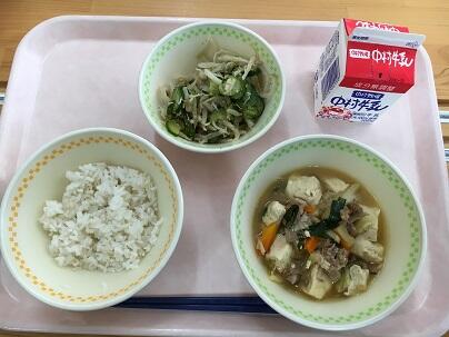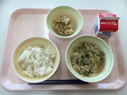 麦ごはん、牛乳、魚の竜田揚げ、野菜のレモンあえ、五目豆腐スープ