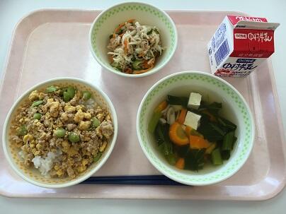 そぼろごはん、牛乳、すまし汁、千切り大根のサラダ