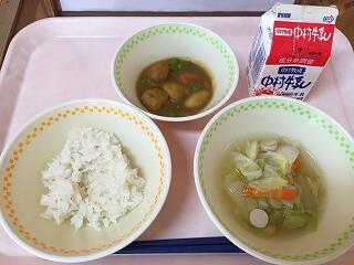 茶飯 牛乳 きび団子汁 ヤマメの唐揚げ もやしの酢の物