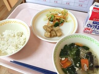 麦ごはん 牛乳 野菜スープ からあげ ほうれん草の和え物