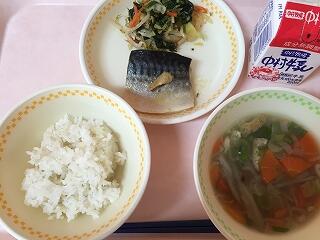 麦ごはん 牛乳 野菜スープ さばのトマト煮 にんじんとあさりのサラダ