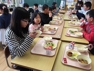 今日は、1年生と6年生(松組)の交流給食を行いました。いただきますの前に、1年生は感謝の気持ちを伝えて、会食をしました。班ごとに自己紹介から始まり、好きなことの紹介をしたり、6年生のお話を聞いたりと楽しい時間を過ごしているようでした。