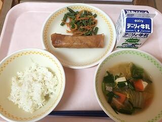 麦ごはん 牛乳 キムチスープ おいしい春巻き いんげんのごま和え