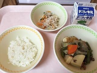 今日は、あじのほぐし身を使ったそぼろごはんです。あじの他に糸こんにゃく、青豆、にんじんも入っています。味付けはうすくちしょうゆとこいくちしょうゆ、みりん、酒を同量で味を付けます。とっても簡単で、おいしく魚を食べることが出来ます。子どもや先生に好評でした(^_^
