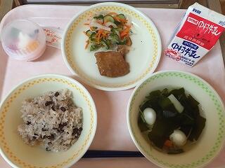 赤飯 牛乳 吸い物 照り焼きチキン きゅうりとちりめんの酢の物 お祝いデザート