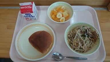 炒めビーフン、ミルクパン、牛乳、フルーツポンチ