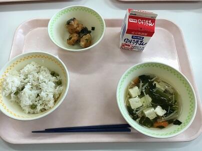 えんどう豆ごはん、すまし汁、魚のねぎソース和え、牛乳