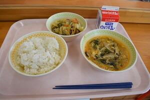 麦ごはん、厚揚げの磯煮、ほうれん草とツナのおひたし、牛乳