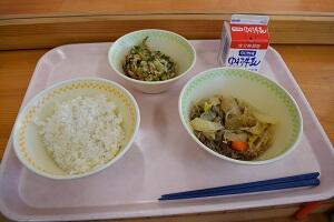 麦ごはん、高千穂牛すきやき、もずくの酢の物、牛乳