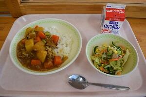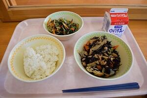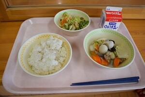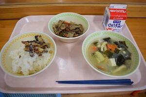 麦ごはん、かりかりなばちゃん、さつまいものみそ汁、五目きんぴら、牛乳