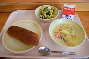 黒糖パン、ペンネのクリームソース煮、ブロッコリーサラダ、牛乳