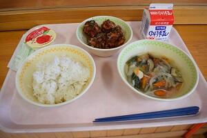 麦ご飯、春雨スープ、たこやき風、りんごゼリー、牛乳