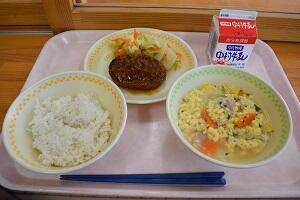 麦ご飯、チーズスープ、煮込みハンバーグ、野菜のレモン和え、牛乳
