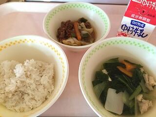 十二穀米 牛乳 五目豆腐スープ 鶏肉とさつまいもの揚げ煮