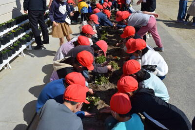 1年生から5年生で、3月の卒業式、4月の入学式に向けて花壇やプランターの草抜きや花摘みなどの整備をしました。