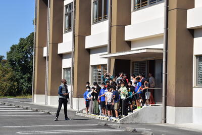 清掃中に理科室からの出火を想定し、児童に予告なしに行いました。本校は、低学年から高学年までの縦割り清掃を行っています。子どもたちは火災報知器の突然の音に少しためらった様子も見られましたが、高学年の児童がリードして大変静かに、かつ迅速に運動場に避難を完了することができました。
