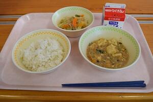 麦ごはん、麻婆豆腐、海藻サラダ、牛乳