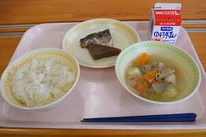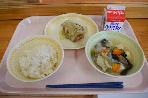 茶飯、鶏ごぼう汁、魚のみそマヨネーズ焼き、牛乳