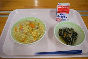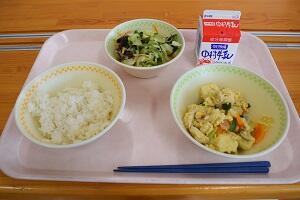 麦ごはん、高野豆腐の卵とじ、千切り大根のオーロラサラダ、牛乳