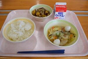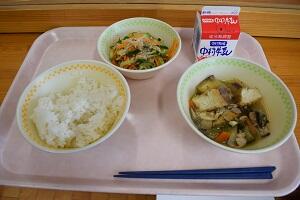麦ごはん、なすと厚揚げのみそ炒め、きゅうりとちりめんの酢のもの、牛乳