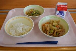 麦ごはん、豚肉とたけのこの炒め煮、きゅうりの中華あえ、牛乳
