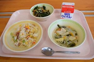チキンライス、ポテトスープ、ツナサラダ、牛乳